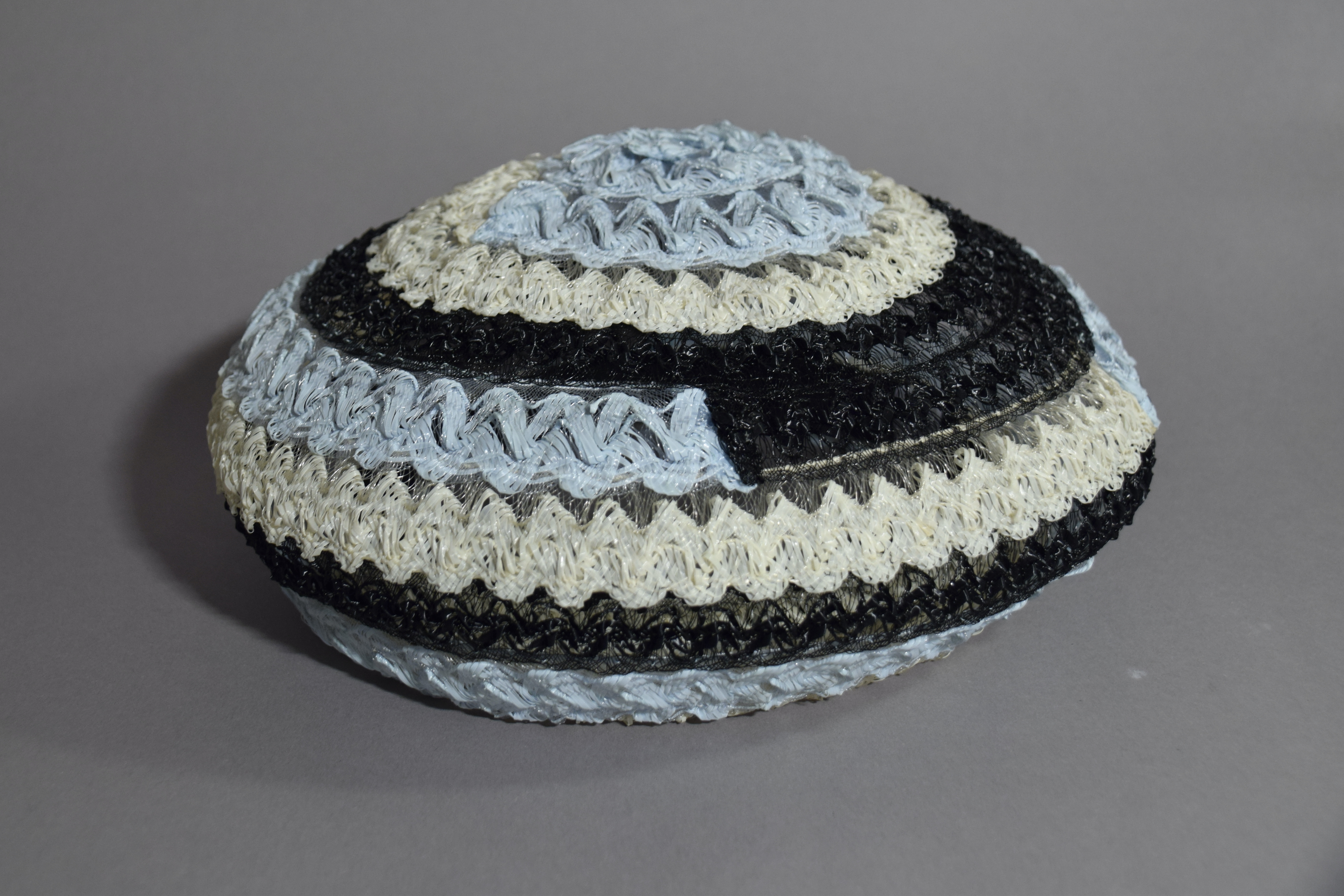 High fashion summer vibes with this light as a feather beret elaborately crafted from individual strips of vintage partially sheer horsehair racello braid in baby blue, cream and black.