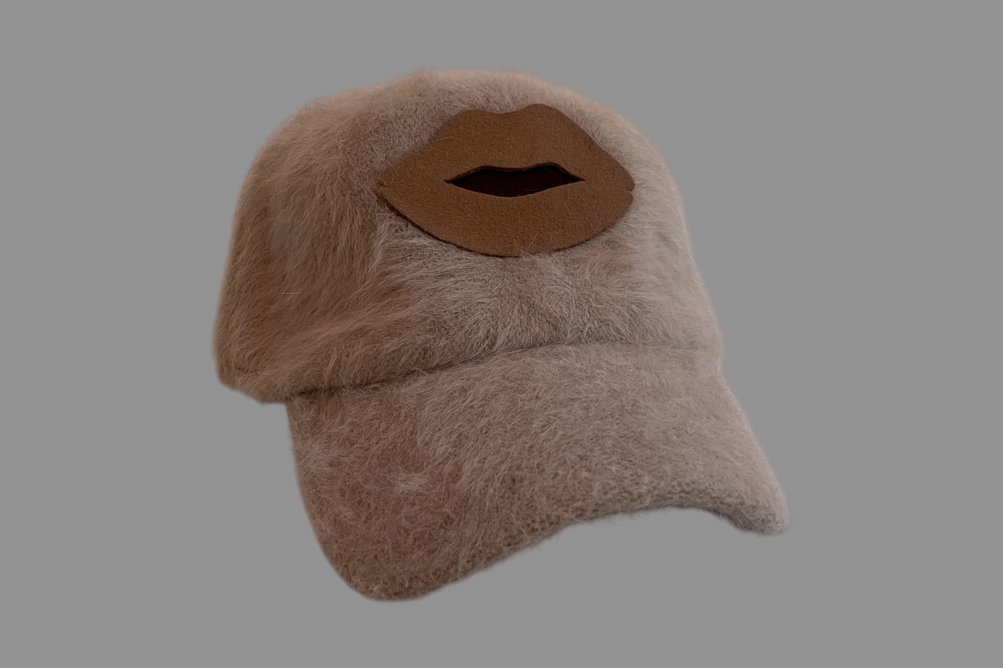 Jeweils mit einem handgefertigten Kussmund aus Hutfilz versehen, gibt es die Caps in den Farben Schwarz, Dusty Pink, Camel und Sand. Die Caps sind One-Size dank größenverstellbarem Klettverschluss am Hinterkopf.