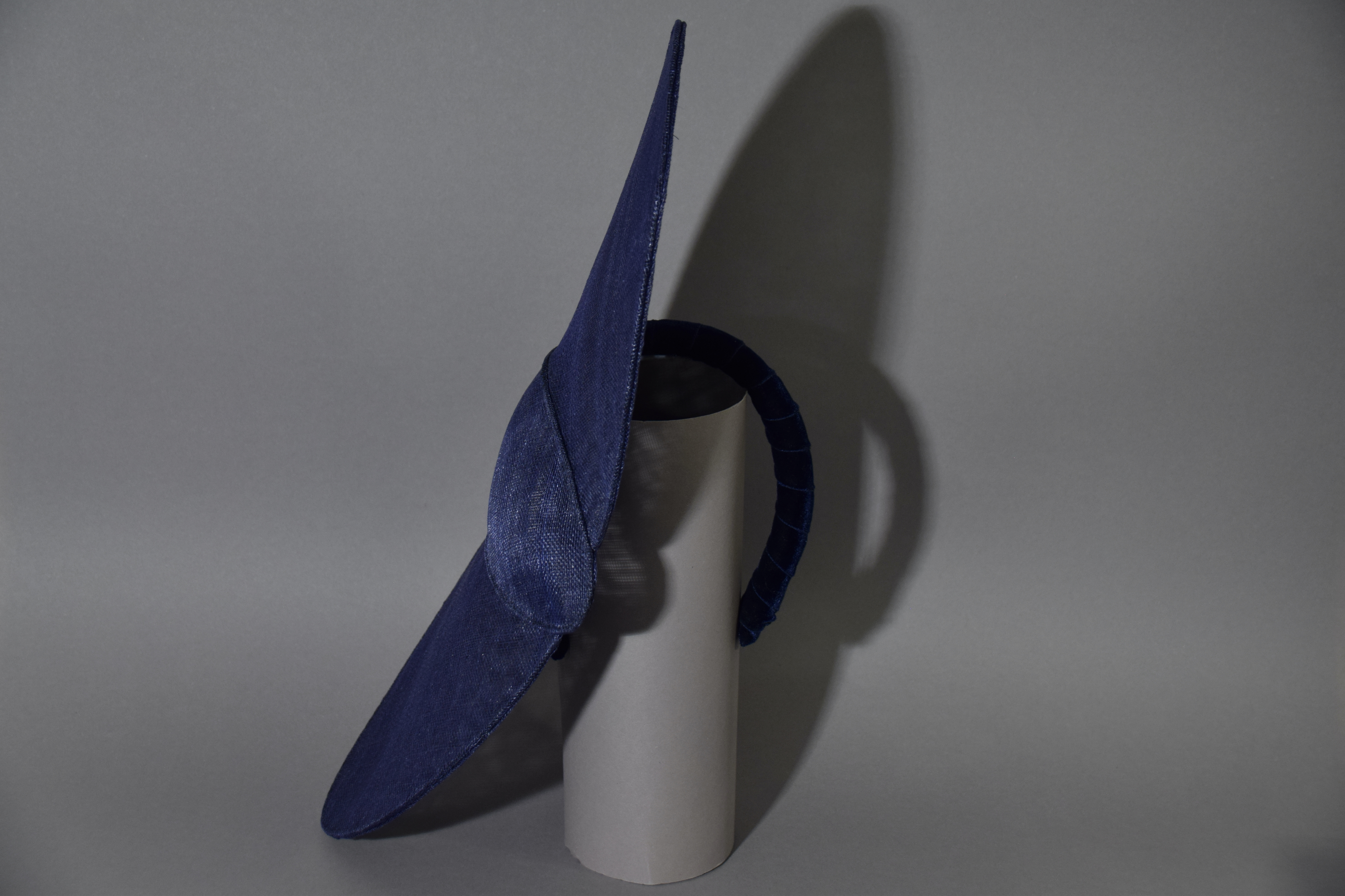 Handgefertigt aus tiefblauem Sinamay-Stroh und auf einem Samthaarreif befestigt.