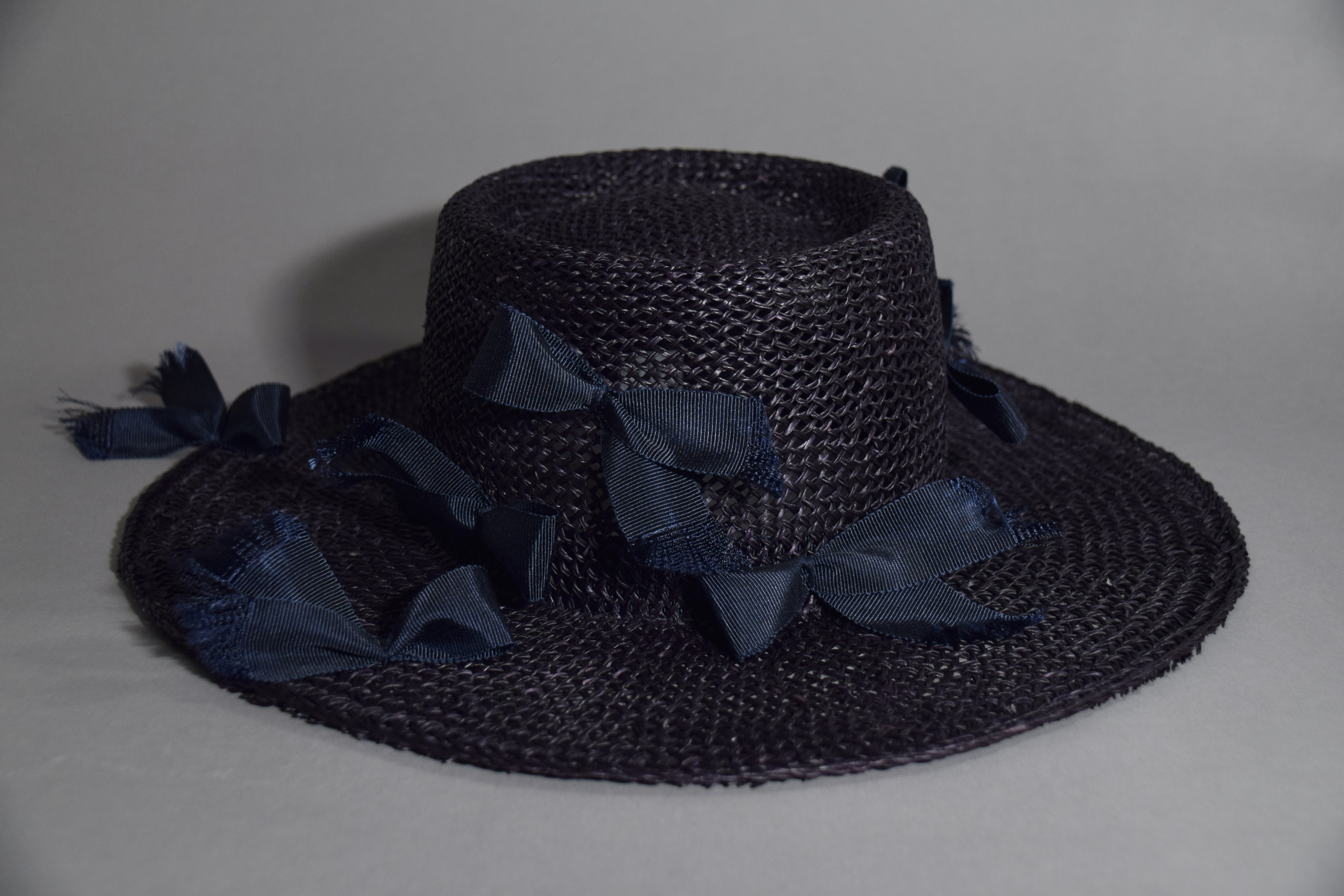 An easy to wear wide brimmed bolero offering effortless elegance for your summer occasions. Made from airy and lightweight seagrass in midnight blue and adorned with cute navy grosgrain bows playfully placed around the hat like butterflies taking a short rest.