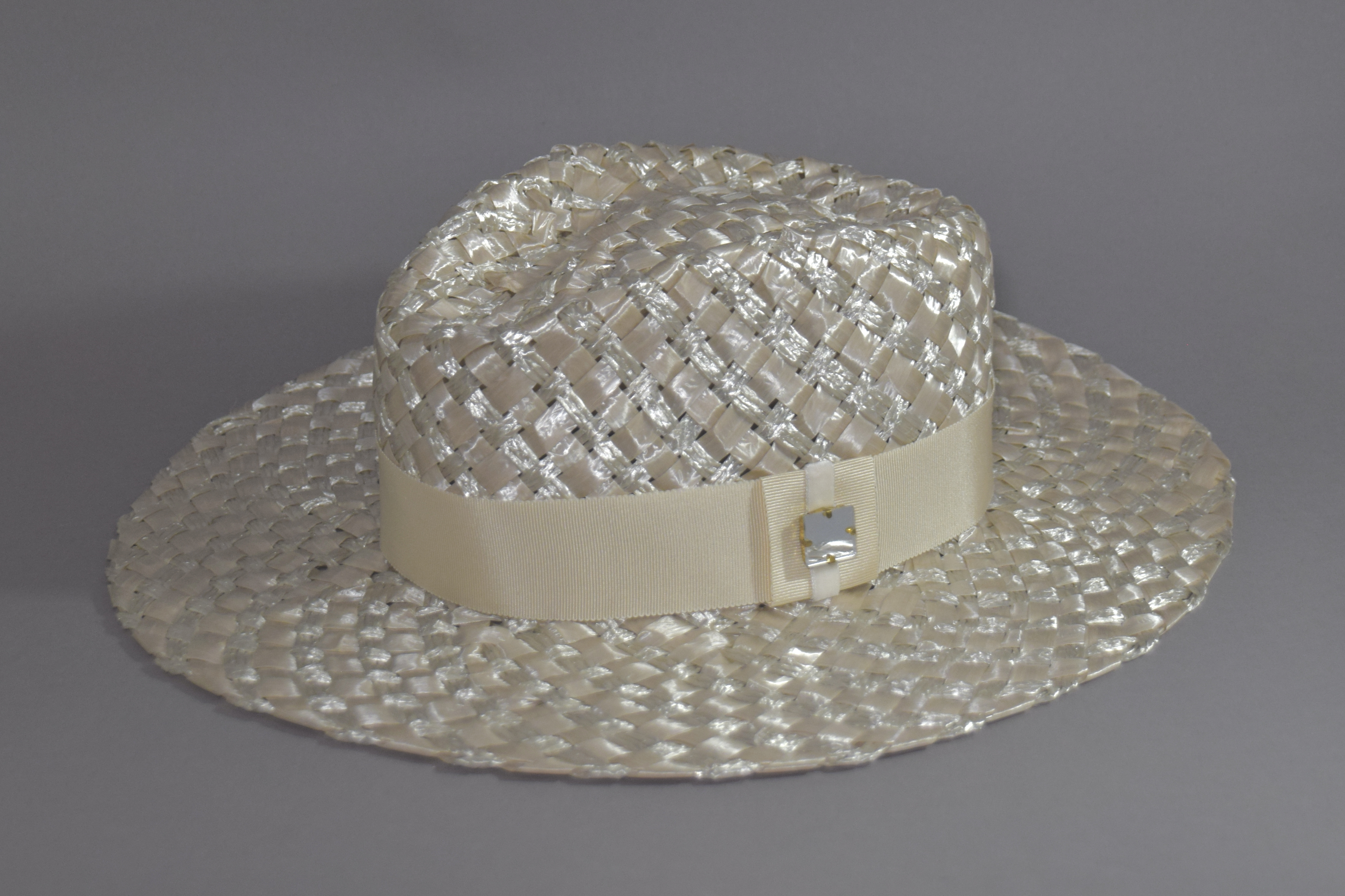 Stylish und elegant: Fedora Brauthut handgeformt aus wunderschönem vintage Racellogeflecht mit breitem cremefarbenem Ripsband und einem Spiegelknopf im Antikstil auf einem schmalen Samtstreifen verziert.